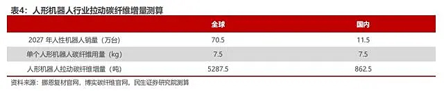 在機器人應(yīng)用方面,民生證券分析師李陽11月13日研報認為,碳纖維作為機器人輕量化核心材料,可應(yīng)用于機械手等部位。據(jù)StratisticsMarketResearchConsulting數(shù)據(jù),2027年全球人形機器人市場規(guī)模預(yù)計為141億美元,有望拉動碳纖維增量5287.5萬噸,成為碳纖維下一個重要增長極。11月13日,吉林化纖在互動平臺上表示,從性價比角度考量,公司的碳纖維產(chǎn)品可用于機械臂或人工智能領(lǐng)域。未來公司會積極與相關(guān)公司進行接洽合作,共同開發(fā)碳纖維在這些領(lǐng)域的應(yīng)用。同日,中復(fù)神鷹也在互動平臺表示,目前公司在工業(yè)機器人領(lǐng)域已有應(yīng)用,相信未來隨著碳纖維產(chǎn)品的最佳特性不斷應(yīng)用于機器人技術(shù)上,機器人技術(shù)本身將進一步發(fā)展突破。